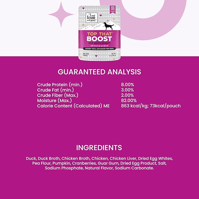 "I and love and you" Top That Boost Wet Dog Food Pouch, Duck Recipe In Gravy, 3 oz (Pack of 12)